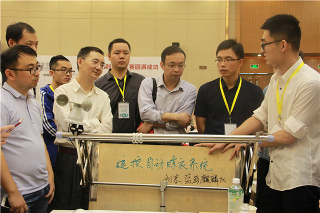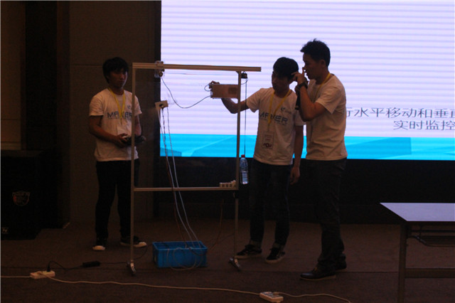 此次中美青年创客大赛是不间断开发、创作的创客马拉松比赛,比赛时间长,开发强度大,在经历将近43小时奋斗之后,最终迎来了大家都希冀的12日下午的项目汇报路演。第一支代表我院上台路演的是9号蓝岛麒麟队,他们带来的项目是远程自动晒衣系统,旨在解决上班族和经常外出人群的晒衣问题,晾衣系统在遇到强风,下雨,曝晒等天气的情况下可做出判断自动将衣物收进屋内,也可通过手机远程控制进行自动收放。