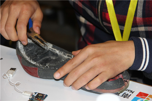 第二支队伍是14号蓝岛创客队,为现场创客伙伴带来的是便携式移动智能鞋,其中的GPS系统可以随时给人定位,并且利用人体重力走步充电,节省了充电环节。我们的小伙伴还加入手机APP有范围呼叫功能,让鞋子变得与众不同。