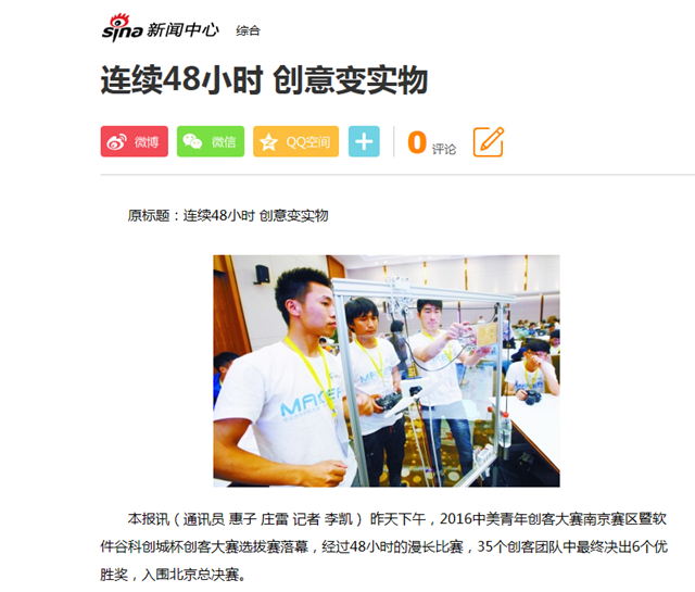 在48小时的作品创作和汇报路演中,不时有其他高等院校的创客和厂商过来与我院蓝岛创客空间的创客们进行沟通交流,作品完善的同时,各团队之间的交流学习也在不断进行。充分体现了本次大赛人文交流的特色,以比赛促进青年创客的交流、以比赛促进创客文化和生态建设。青年人的思想,在沟通交流中碰撞出不一样的创新火花,这对我们项目作品的完善起到了一个很好的促进的作用。我院本次参赛作品因“智能、科技、人文关怀”受到了各大媒体的广泛关注,诸如南京日报、凤凰财经、新浪网、雨花电视台等媒体纷纷对我院的参赛队伍进行了报道。新浪网,南京日报均对蓝岛的“基于无人机技术的高层玻璃清洗解决方案”进行了详尽的报道。