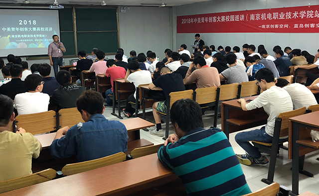 巡讲开始,南京创客空间创始人郑岩峰先生带来了“创客时代的创新机遇”的主题分享,他从如何获得创新机遇、创新的难点、创新创业的基本技能和在比赛中历练创新技能等几个方面利用大量的创新创业案例跟大家进行了分享。随后,他从作品的创新创意优势,作品的完整性和作品的应用前景分析了历年中美青年创客大赛获奖作品代表的特点,并对2018年中美青年创客大赛的参赛热点进行了剖析。