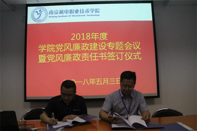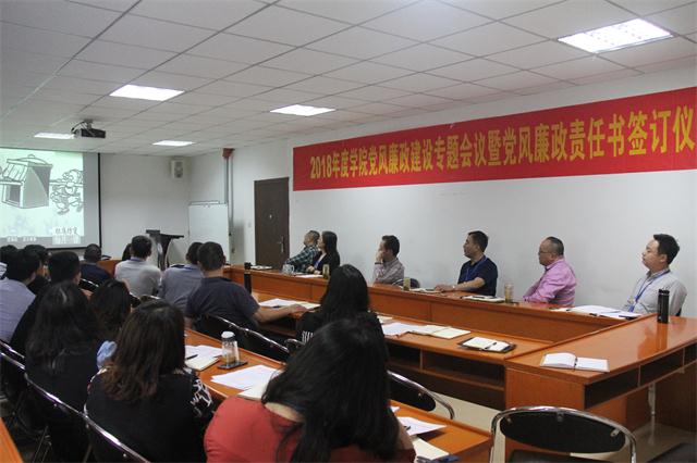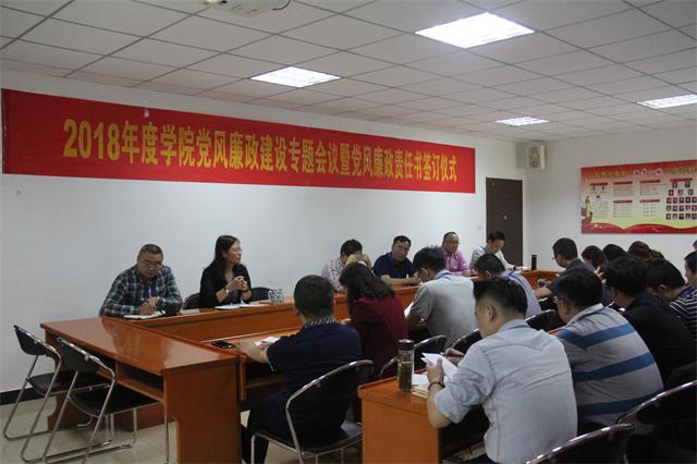 为深入贯彻十九大精神,按照“党要管党、全面从严治党”的要求,增强干部全面从严治党主体责任意识,扎实推进党风廉政建设责任制的落实,进一步传导压实党风廉政建设责任,学院党委于2018年5月3日13:30在弘德楼107会议室召开了学院2018年度学院党风廉政建设专题会议暨党风廉政责任书签订仪式,会议由工会主席、纪委副书记、办公室主任孔德丽主持,全院中层及以上领导参加了此次会议。