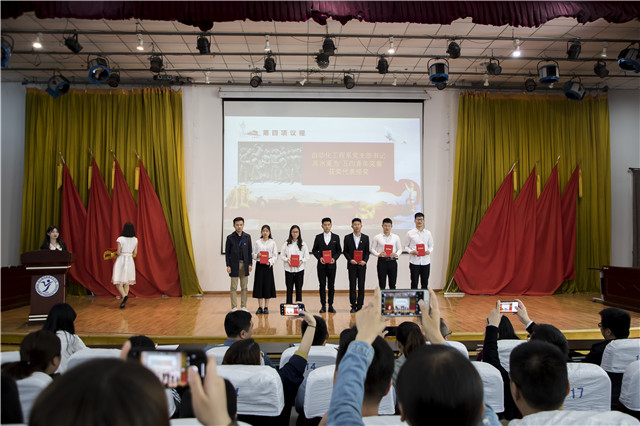 表彰大会在雄壮的《中华人民共和国国歌》歌声拉开帷幕。我们的党,历经98年的风风雨雨,始终不变的是全心全意为人民服务的宗旨,在他的旗帜下,涌现出许许多多优秀的中华儿女,前赴后继,为中华之强盛而奉献青春和生命。全体新老团员在团员代表朱砾的带领下重温了入团誓词。