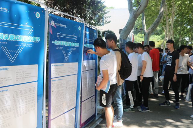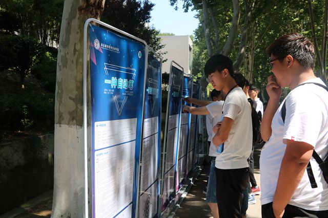 一进校园,登峰路两侧排列着100件优秀学生专利展示海报,吸引了领导、嘉宾、校外媒体和学院师生们驻足观看,展前人头攒动、络绎不绝。同学们纷纷拿起“点赞贴”为喜爱的学长专利点赞。