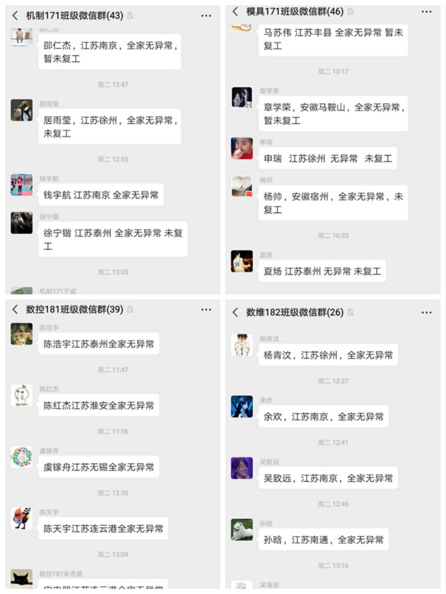 俗话说:“火车跑得快,全靠车头带”,班干部是班级同学的带头人,是班级的骨干力量,对班级同学的情况更为了解、更为熟悉,尤其每个辅导员都带好几个班,正是有了班干部的得力辅助,很多事情事半功倍。疫情当前,各班成立了以辅导员为组长,以班长、团支书为副组长,以其他班委为组员的疫情防控小组,时刻关注班级同学动态,做好班级同学的身体情况、家庭住址、家人身体情况的更新汇总,第一时间掌握疫情现状。