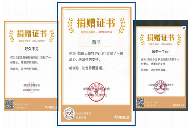 175021班的毕英凡,这个假期他拿了500块钱压岁钱,这钱对于很多同学而言不是什么大钱,可对于他而言,已经是一笔不小的数目了,本想攒下这些钱为自己买双心仪已久的篮球鞋,但是当他看到湖北和全国疫情严重,他毫不犹豫就把钱全捐了。他说,比起新鞋子,我更希望大家能一起开心地奔跑在球场上感受阳光与激情!173031的黄浩,在家隔离疫情的这一段时间,看着新闻里各路的爱心人士的捐款捐物,黄浩的内心非常感动。一方有难八方支援,这是深植于中华民族血脉的同胞情义。他也想为灾区贡献出自己的一份力量,通过网络平台,在腾讯公益为《战疫天使守护计划》贡献了一份爱心。