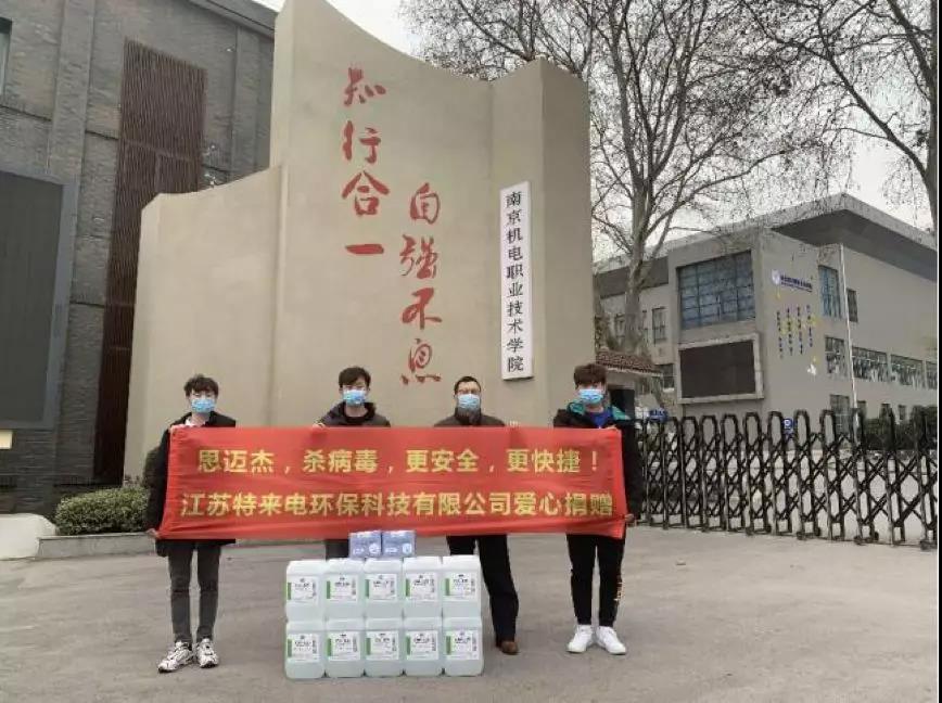 江苏特来电环保科技有限公司副总经理闫斌校友(2017届检测技术及应用)、销售经理徐浪校友(2018届供用电技术)和项目经理梁建伟校友(2019届供用电技术)心系母校,向母校捐赠消毒水和口罩等抗疫物资,支持学校的疫情防疫工作。闫斌等三位校友表示:疫情无情人有情,希望学弟学妹安全健康返回校园。祝愿母校越办越好,顺利搬迁新校区。