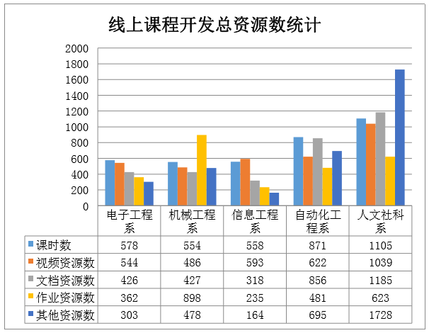 在线课程总课时4996课时,已建设完成3666课时,上传资源总数12463个,其中视频上传数3284个,文档资源数3212个,作业资源数2599个,其他资源数3368个。线上课程每日资源数都在增加,3月22日在线课程建设新增116课时,新增资源总数682个,其中视频上传数177个,文档资源数281个,作业资源数77个,其他资源数147个。