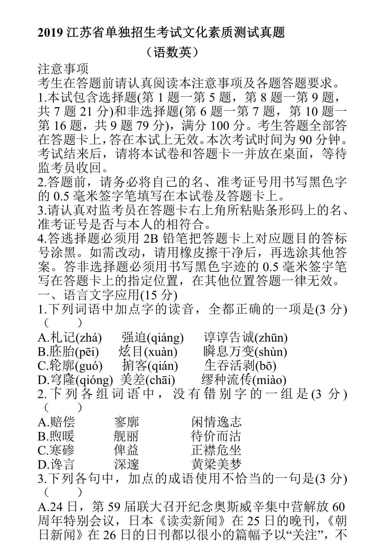 2019年江苏省提前招生真题卷(语文)