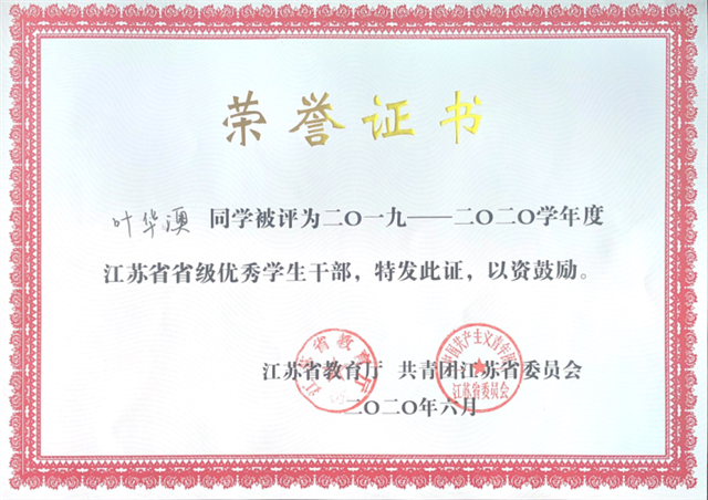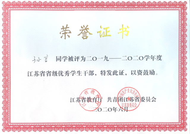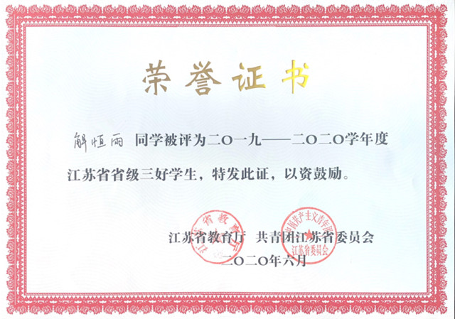 日前,江苏省教育厅、共青团江苏省委公布了关于表彰2020年度江苏省普通高校省级三好学生、优秀学生干部和先进班集体的决定,我院自动化工程系解恒雨同学荣获“江苏省三好学生”称号,人文社科系孙言、机械工程系叶华澳同学荣获“江苏省省级优秀学生干部”称号,自动化工程系机电一体化172班荣获“江苏省先进班集体”荣誉称号。
