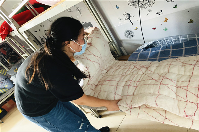系部的老师和宿管阿姨们,逐一来到学生宿舍,帮助同学晒被子。在这个过程中,细心的老师们会给每一床被褥,贴上标签。早上九点,老师们准时来到宿舍,根据名单进行晒被。宿舍楼的阳台上、空地上的晾衣杆等都挂满了花花绿绿的被褥。中午两点半左右,老师们再将被子按照标签,一一放回原位。经过4个多小时日光浴的被子变得蓬松柔软。