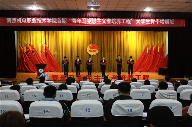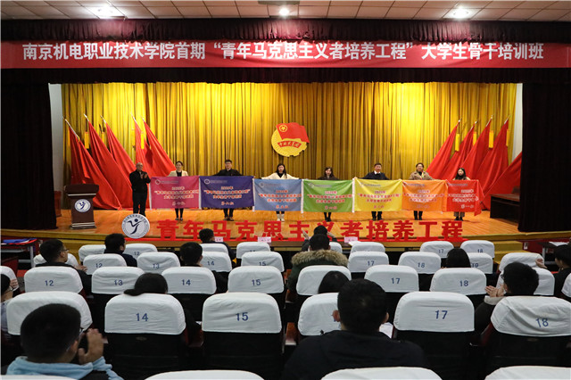 为深入贯彻落实习近平新时代中国特色社会主义思想和党的十九大精神以及《中长期青年发展规划(2016-2025)》《高校思想政治工作质量提升工程实施纲要》《“青年马克思主义者培养工程”实施纲要》等文件精神,推进“青年马克思主义者培养工程”的实施,改进创新面向广大青年学生的思想引领工作方式,着力培养新时代“爱国、励志、求真、力行”的社会主义合格建设者和可靠接班人,依照共青团“凝聚青年、服务大局、当好桥梁、从严治团”的工作格局,在广大青年中着力培养、造就一批经由马克思主义中国化的最新成果武装的年轻学生干部,使他们努力成为共产主义远大理想的坚定信仰者、社会和谐的积极促进者,南京机电职业技术学院首期“青年马克思主义者培养工程”大学生骨干培训班于2020年11月25日晚在报告厅顺利开班,并举行首场报告。米兰官方网页版党委委员、副院长赵学洪,纪委副书记、党委工作部部长周启国,学生工作处处长张宝中,党委工作部副部长张玥出席活动。学院各系部团总支书记、青马班各小组指导老师、学生干部骨干、青马班全体成员等80余人参加开班仪式。团委书记唐钰峤主持本次活动。