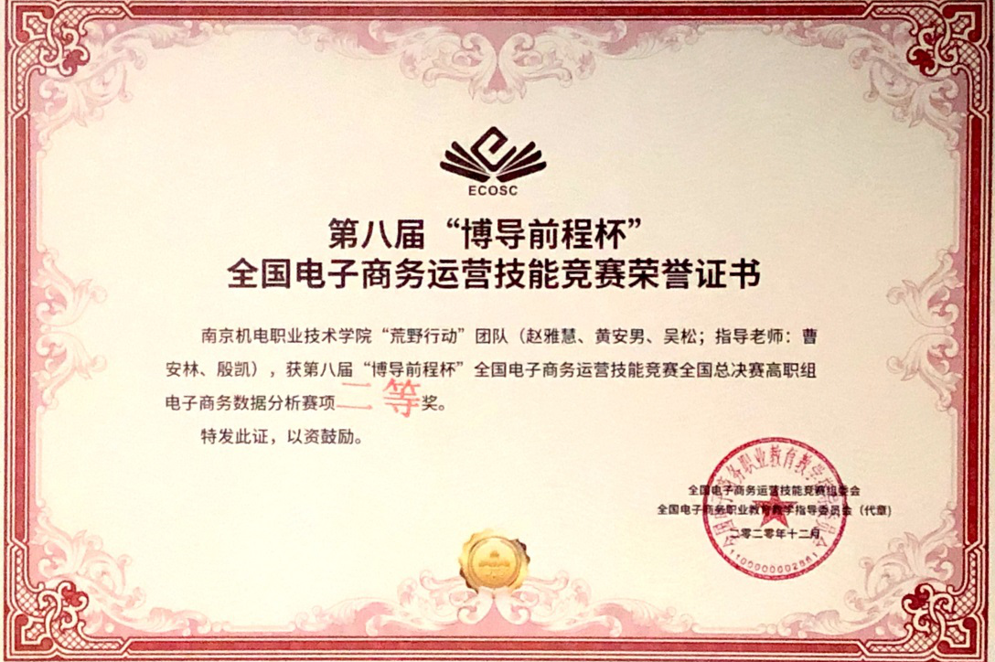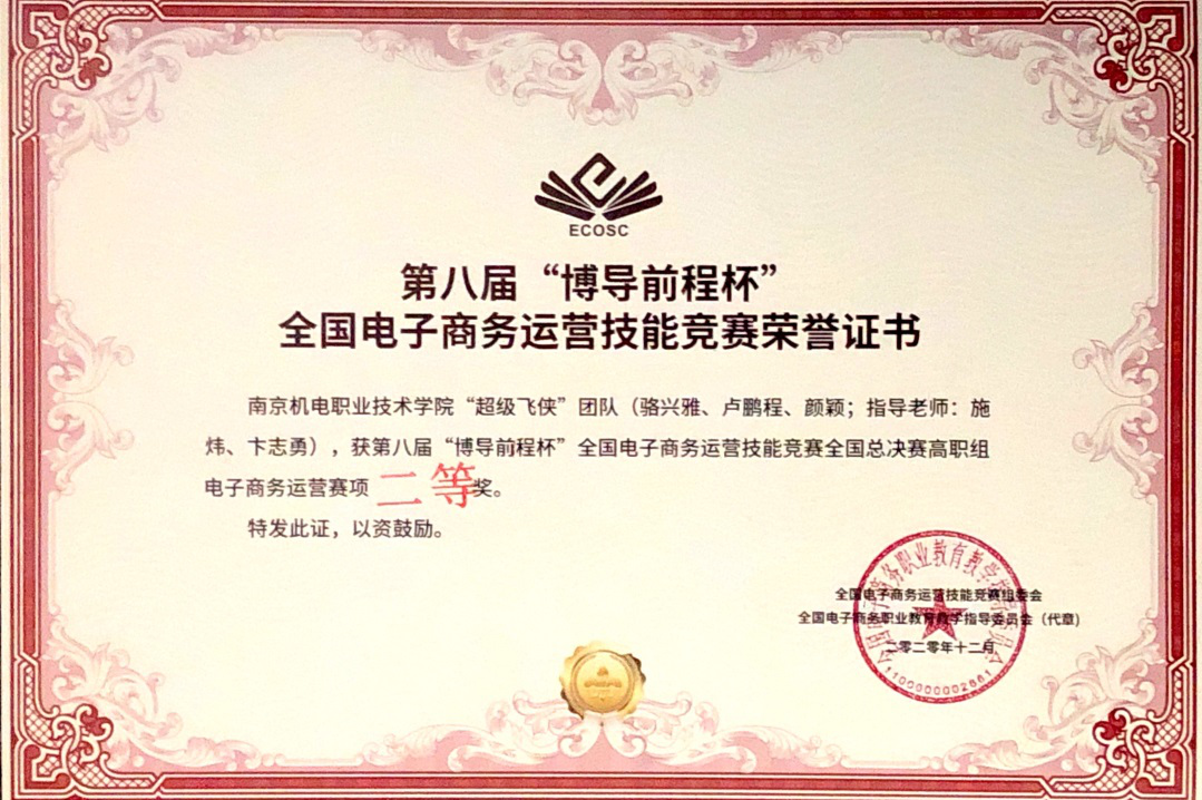 2020年12月29日,第八届“博导前程杯”全国电子商务运营竞赛决赛在苏州经贸职业技术学院举行。米兰官方网页版电子商务运营“超级飞侠队”团队(骆兴雅、卢鹏程、颜颖;指导老师:施炜、陈洁)以及电子商务数据分析“荒野行动队”团队(赵雅慧、吴松、黄安男;指导老师:殷凯、曹安林)双双荣获高职组全国总决赛二等奖。