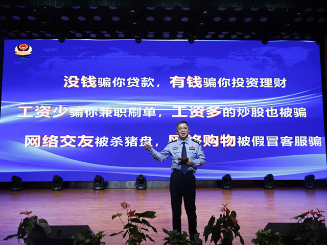 随后,古柏派出所民警马意彪和砖墙派出所民警肖龙泉带来首场反诈宣讲大练兵演讲。马警官用诙谐幽默的讲解风格为老师和同学们深度分析了杀猪盘类型、冒充网购客服物流类以及网络游戏产品虚假交易类等网络诈骗的真实案例。最后他总结出了以下三点,希望同学们能够做到“不轻信、不点击、不转账”。肖警官结合自己十年民警经验,针对当下网络电信诈骗高发案例进行详细分析与建议,通过与现场同学的“案发现场”重现,给同学们留下深刻影响。最后他向我们展示了电信诈骗犯罪现场的真实视频,以此严厉告诫同学们对于电信诈骗不要抱有侥幸心理,作为新时代的青年人更想不得、碰不得。