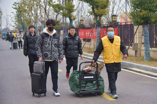 返校当天学校各部门工作人员分工协作、密切配合,做好学生返校报到现场周边的秩序维护和身份核验、交通管制引导、行李消杀等工作,为学生安全平稳有序返校保驾护航。