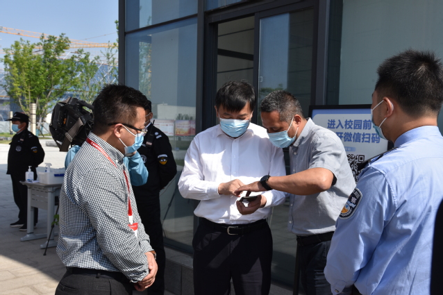 潘卫率区相关职能部门在我校东门认真查看“场所码”标识,并询问了我校疫情防控开展情况。周庆礼介绍目前学校实行全封闭管理,所有外来人员不得进校,所需日常物资在学校南门接驳进入校。