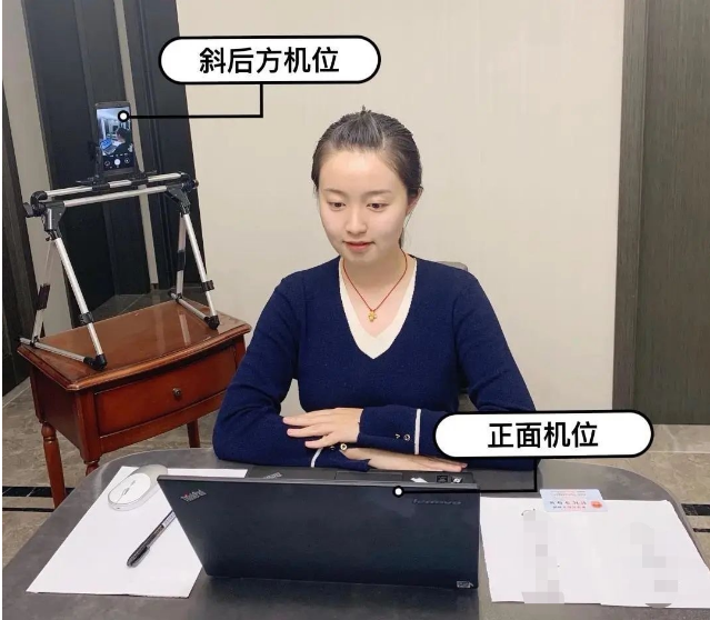 考生双手摆放桌面,第一机位从正面拍摄,放置在距离本人30cm处,完整拍摄到考生双手以上身体部位。第二机位从考生侧后方45°距离本人1m处拍摄,可以拍摄到考生侧面及主设备电脑全屏幕,需保证面试考官能够从第二机位清晰看到第一机位屏幕。