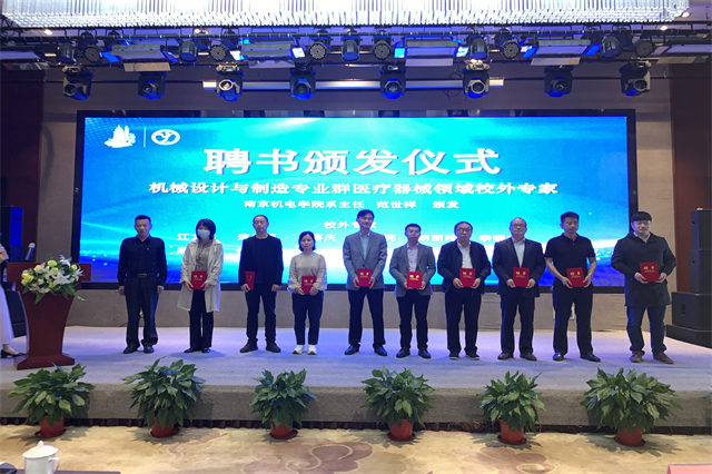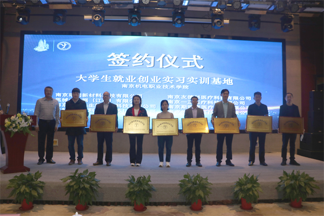 学校副院长刁爱军与南京医疗器械产业园八家龙头企业共同签订大学生就业创业实习实训基地协议,并向企业授予铜牌。校企双方将进一步深化产学研合作,为学生提供实践、创新、成长的机会,为企业引进应用性人才创造条件。学校机械工程系主任范世祥为企业专家颁发《机械设计与制造专业群医疗器械领域校外专家聘书》。