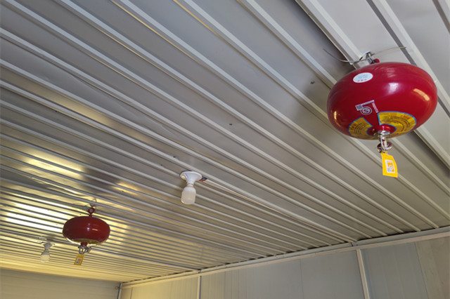 6.消防设备再升级:除传统消火栓和灭火器外,工人生活区新增悬挂式灭火蛋、悬挂式干粉灭火器和消防报警铃,使消防救援更加灵敏、简便、有序和高效。