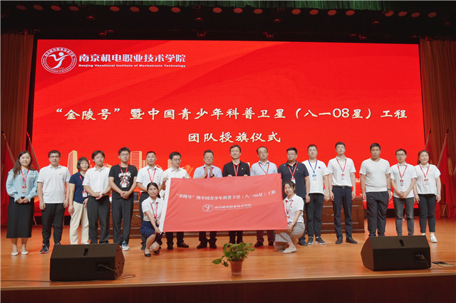 陈赵同志宣读《关于成立“金陵号”暨中国青少年科普卫星(八一08星)工程团队的决定》。周庆礼同志为工程团队授旗。