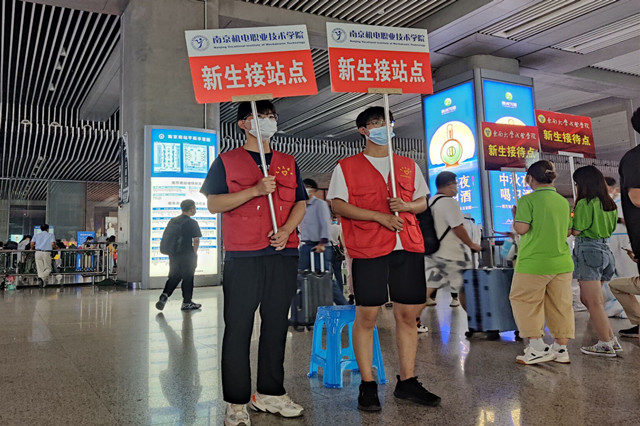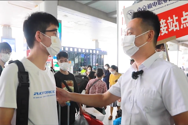 学校安排了数十辆校车分别赶赴南京南站、南京火车站、小红山长途汽车站接新生,各接站点滚动发车,高峰时刻随时增派车辆。每班次车辆都安排有老师带队迎接新生,并安排学生志愿者协助做好接站点的引导工作。