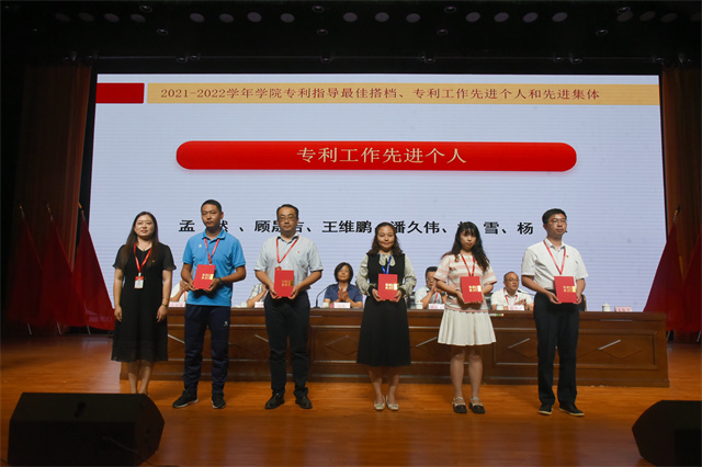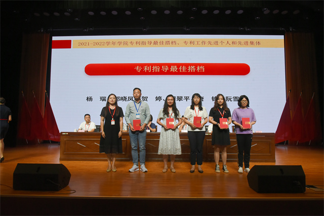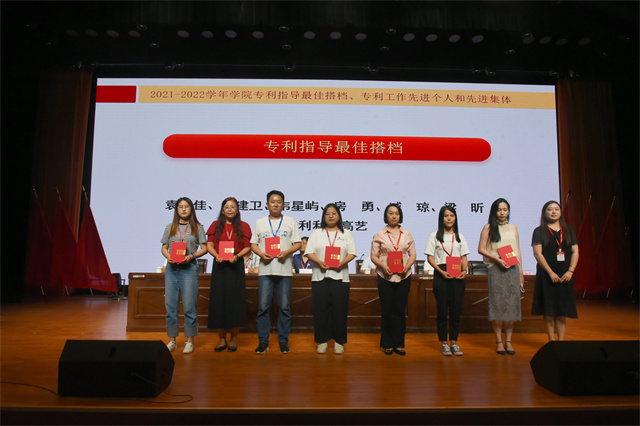 2021-2022学年专利指导最佳搭档、专利工作先进个人、先进集体等受表彰的个人和集体依次上台领奖。大会现场颁发荣获第七届“冠盛杯”创新创意创业大赛暨第八届中国国际“互联网+”大学生创新创业大赛的先进集体。