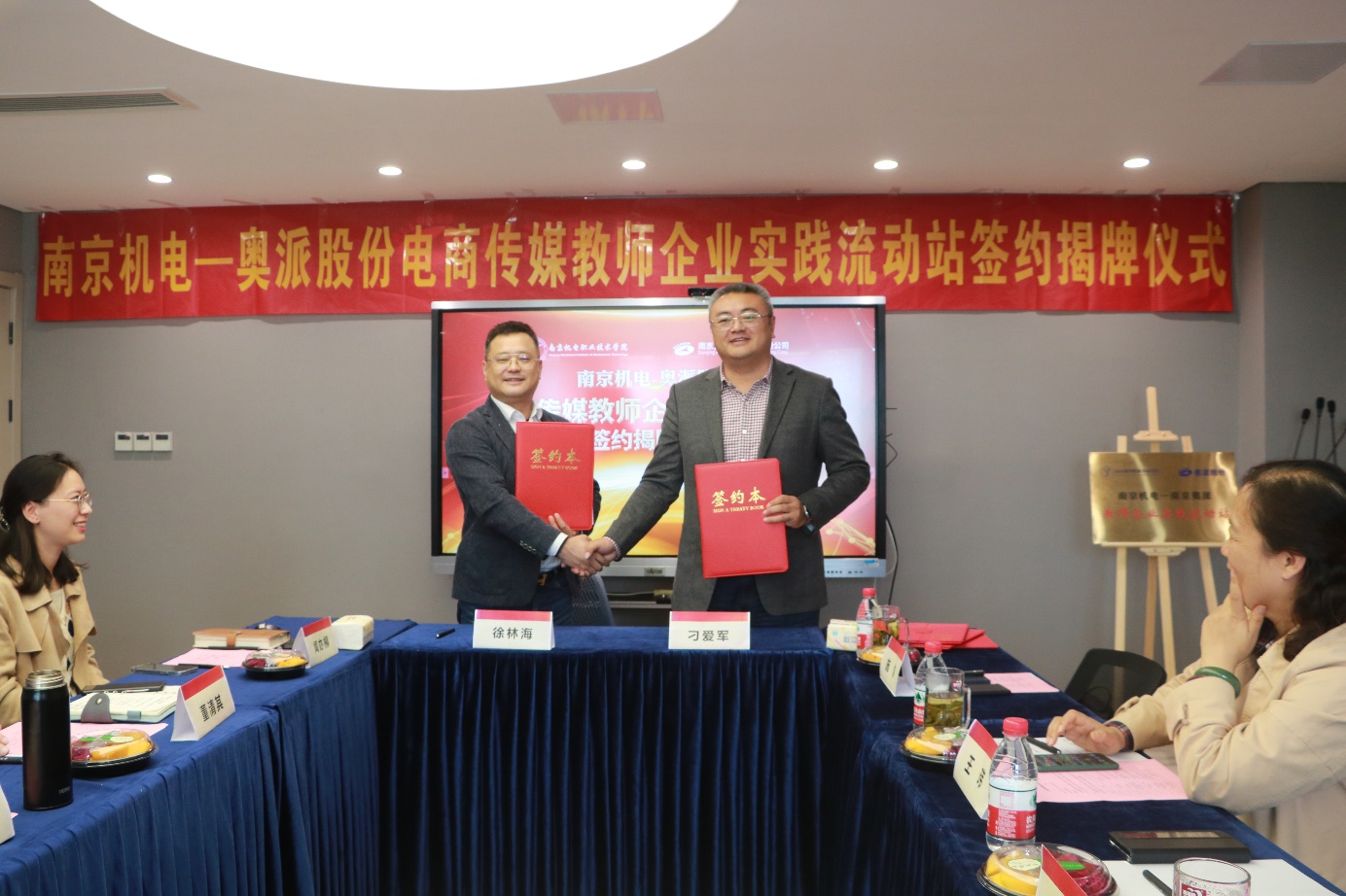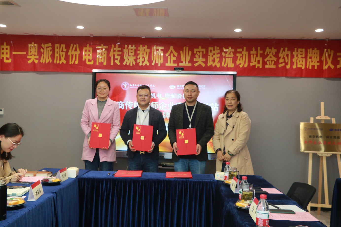 签约授牌仪式上,刁爱军与徐林海共同签署“南京机电-奥派股份电商传媒教师企业实践流动站”校企合作协议,共同揭牌“南京机电-奥派股份电商传媒教师企业实践流动站”。信息工程系主任王玮为教师企业实践流动站的企业导师颁发聘书。