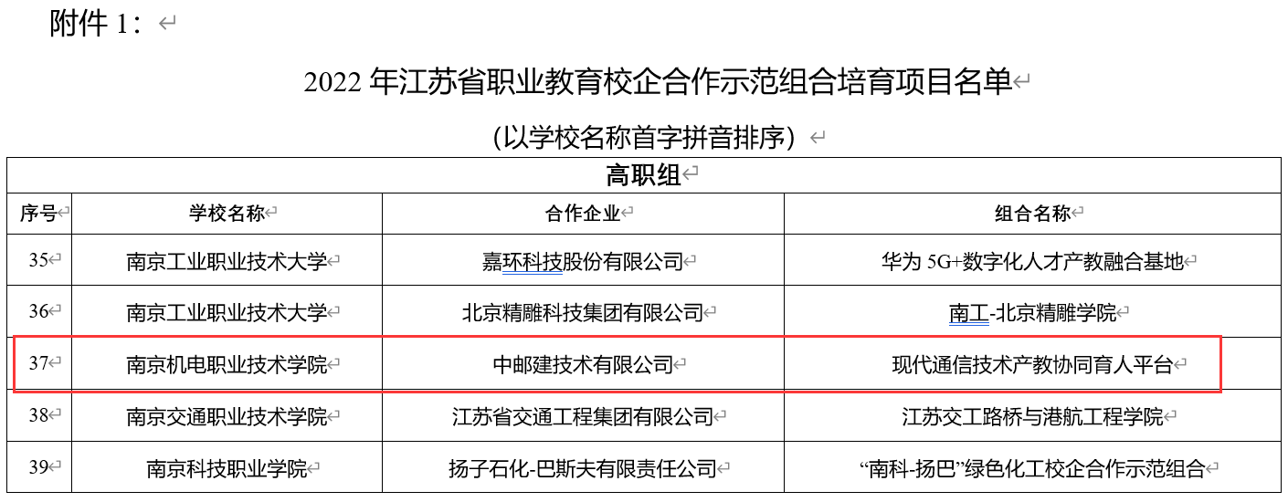 根据《省教育厅关于开展2022年江苏省职业教育校企合作示范组合培育工作的通知》(苏教职函〔202227号)要求,经学校自主申报、专家评审,我校与中邮建技术有限公司共同申报的“现代通信技术产教协同育人平台”顺利入选2022年江苏省职业教育校企合作示范组合性培育项目。