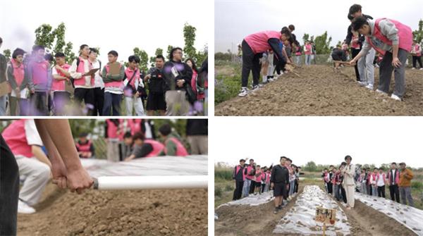 春日里,田间地头一片生机盎然的繁忙景象。指导老师现场讲解劳动工具的使用方法,以及农作时令、农作流程等知识松土、除草、划沟、撒种、灌溉...同学们相互协作、分工明确、井然有序,杂草丛生的四亩田地焕然一新。最后,大家齐心协力为撒种后的菜地拉盖上保温地膜,成功完成农作耕种。