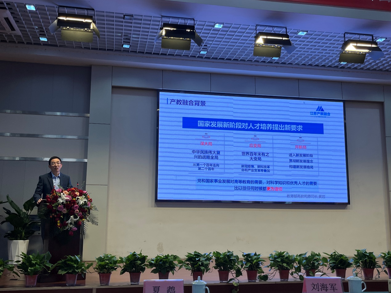 产教融合协同育人论坛上,江苏省产教融合服务平台副主任孙延建作了《深化产教融合 培养优秀工程师 服务产业发展》主题报告,深刻探讨了职业教育如何在新形势下,通过深化产教融合和校企合作,有效培育高质量人力资本,打造适应社会需求的高质量专业人才,服务产业发展和区域经济发展;江苏省环保产业创新中心执行主任卫旺作了《城市碳中和的内涵与实现路径》学术报告,从韧性城市建设、智慧城市建设、推进产城融合建设、推进产业创新以及整个城市的和谐发展等多重视角,全面而具体地阐述了构建面向未来的、系统的城市碳中和解决方案和实现路径。