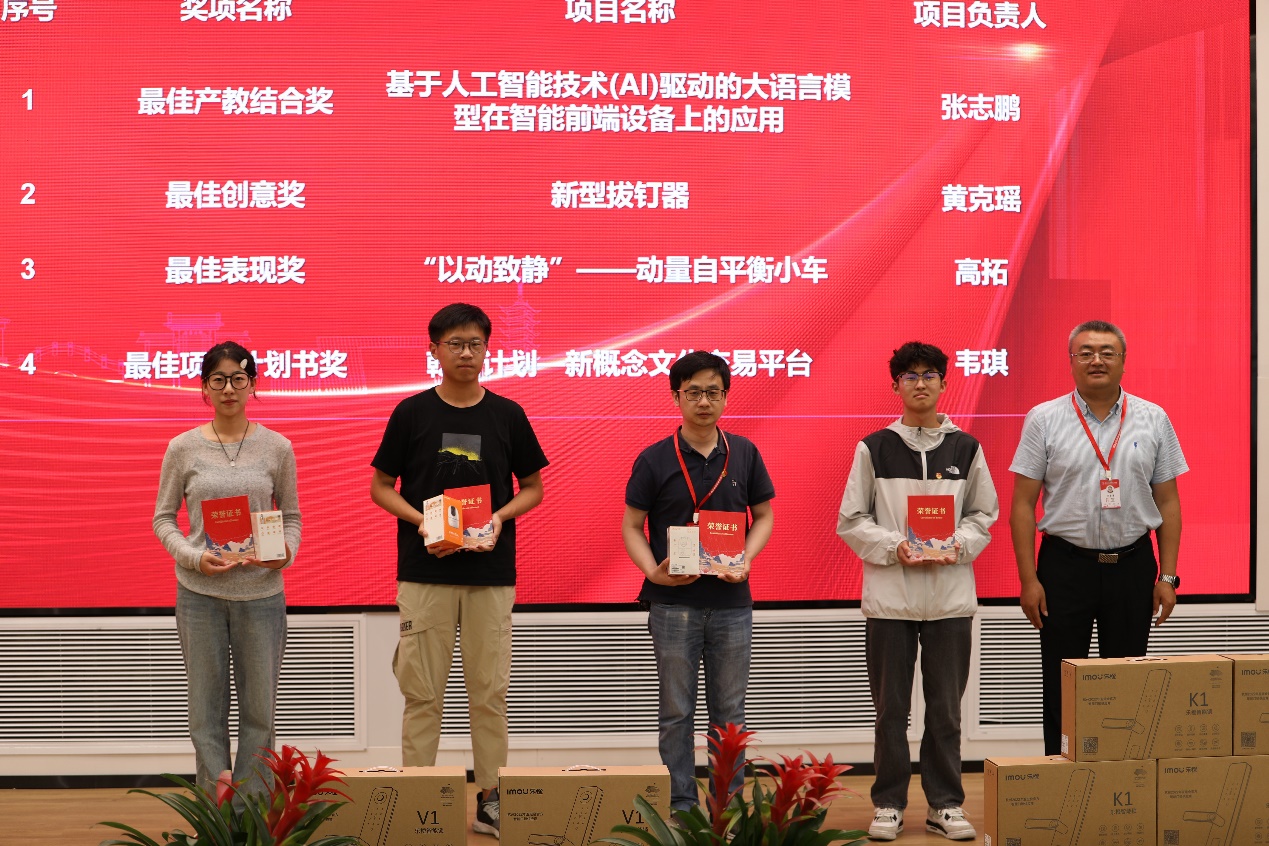 颁奖典礼上,学校党委委员、副院长刁爱军作总结发言。刁爱军指出本次大赛呈现出多方支持、全员参与,项目丰富、包罗万象,校企合作、共创精品等三大亮点。他希望我校师生更具创新活力、更有创意灵感、更富创业激情,以赛促教、以赛促学、以赛促创,充分把握学校与合作企业共同搭建的协同创新平台,以教促产、以产助学、产学互动、学研结合。学校党委委员、副院长郭朝辉宣读了本届大赛现场决赛的评审结果。最终,《基于人工智能可视化巡检监控机器人》等5个作品获一等奖,《乾圆计划—新概念文化交易平台》等10个作品获二等奖,《风光互补路灯及智慧照明系统》等15个作品获三等奖,《“以动致静”——动量自平衡小车》等4个作品获单项奖。