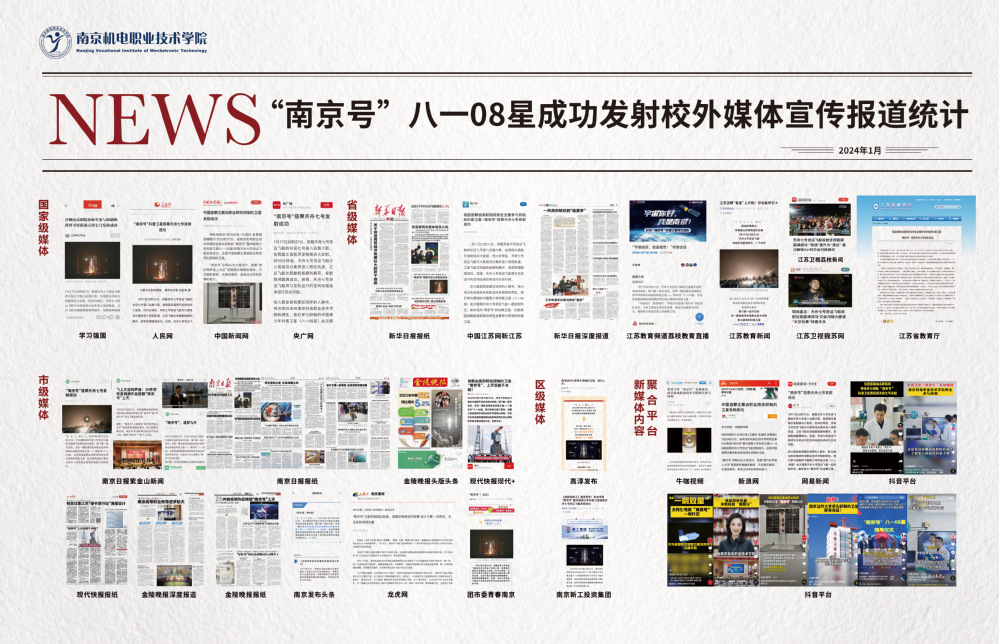 省市级媒体深度报道。省级媒体新华日报率先在头版头条刊登了卫星成功发射的消息。市级媒体南京日报在头版金陵晚报在头版头条第一时间进行了报道。省教育电视台专门到校开设特别访谈节目。江苏卫视跟踪专门报道......新华日报还以“一所高职院校的造星梦’”为主题进行了深度还原。这些报道通过采访相关专家、学者以及参与项目的学校领导和师生团队,以独特的视角和专业的深度深入挖掘了卫星发射背后的故事,探讨了其在人才培养、科普教育、科技创新、航天强国等方面的深远意义,也为读者和观众提供了更加全面、活泼的阅读体验,有效提升了学校的知名度和美誉度。