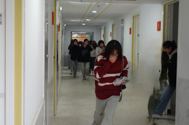 在本次疏散演练前,保卫处利用学校微信公众号向全体师生推送《消防应急疏散逃生知多少?》推文,提醒全体师生关注消防,掌握应急疏散常识。演习过程中按照应急疏散方案既定程序,有序疏散。消防控制中心全程监控应急疏散全过程、启动消防应急广播、打开排烟设施、电梯迫降至1楼,按照“安全第一、就近逃生”的疏散原则,组织师生员工沿应急疏散安全路线有序快速撤离到学校篮球场集中并清点疏散人数。