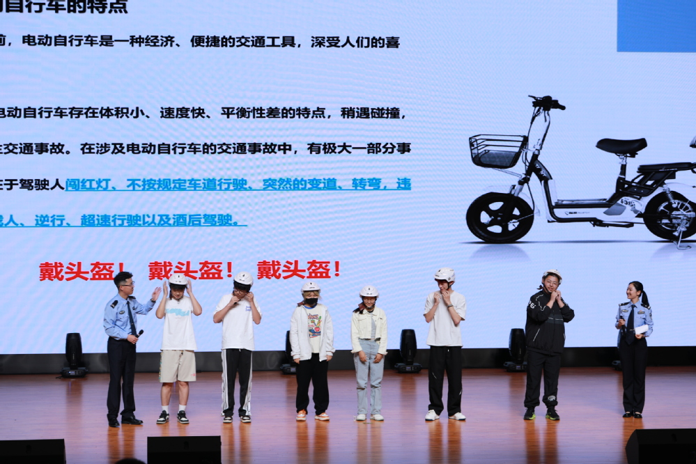 公安分局警官周莹、沈程结合安全教育警示片展示了电动自行车行驶存在的闯红灯、逆向行驶、占用机动车道、超速行驶、不戴头盔、违法载人等严重后果,深入浅出地向学生普及交通安全法规和安全知识,传递“一盔一带”的重要性,邀请学生上台示范如何正确佩戴头盔。现场学生踊跃参与有奖竞答互动,在寓教于乐的欢快氛围中掌握了常规的交通安全知识要点。