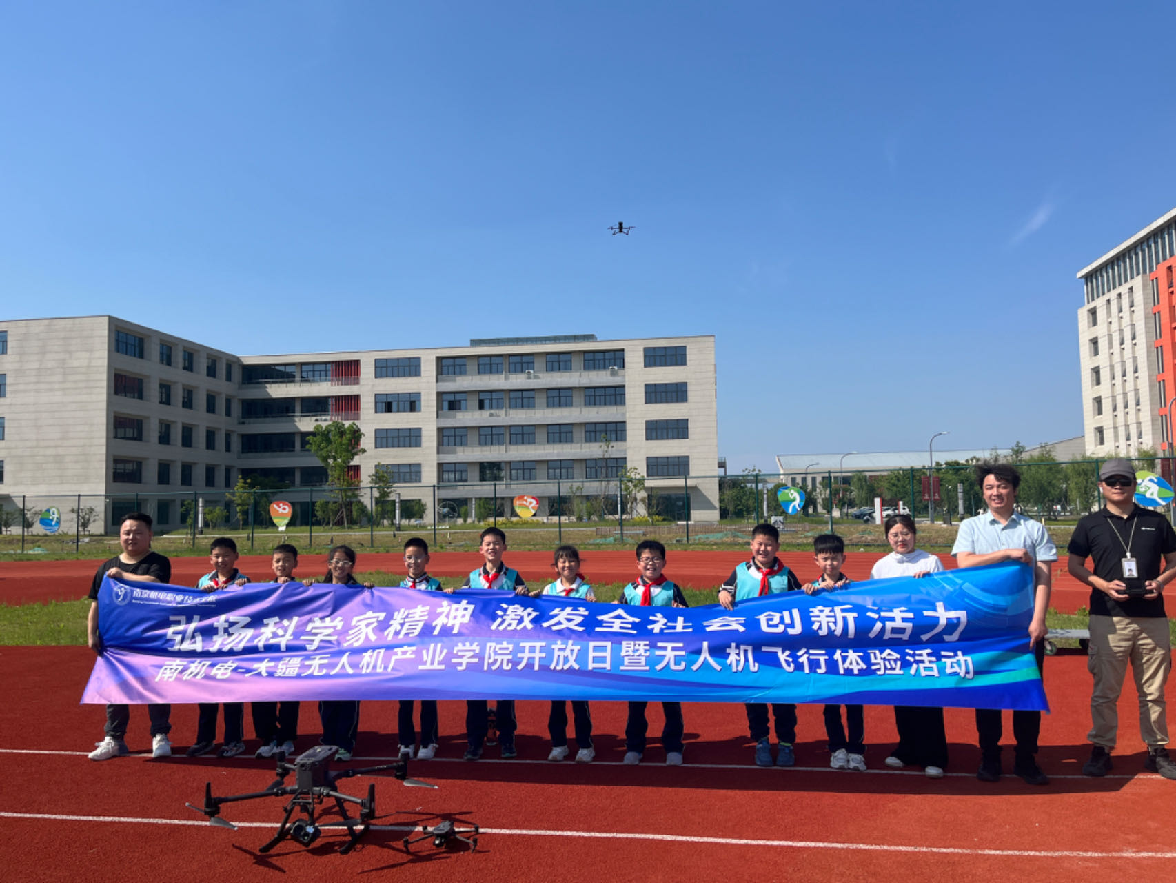 室外无人机场上,同学们兴致勃勃地观摩专业无人机飞手自如地操作着不同型号的无人机,并亲自体验了无人机航拍技术。同学们在亲身体验中感受到了科技的力量,脸上洋溢着满足和兴奋的笑容。
