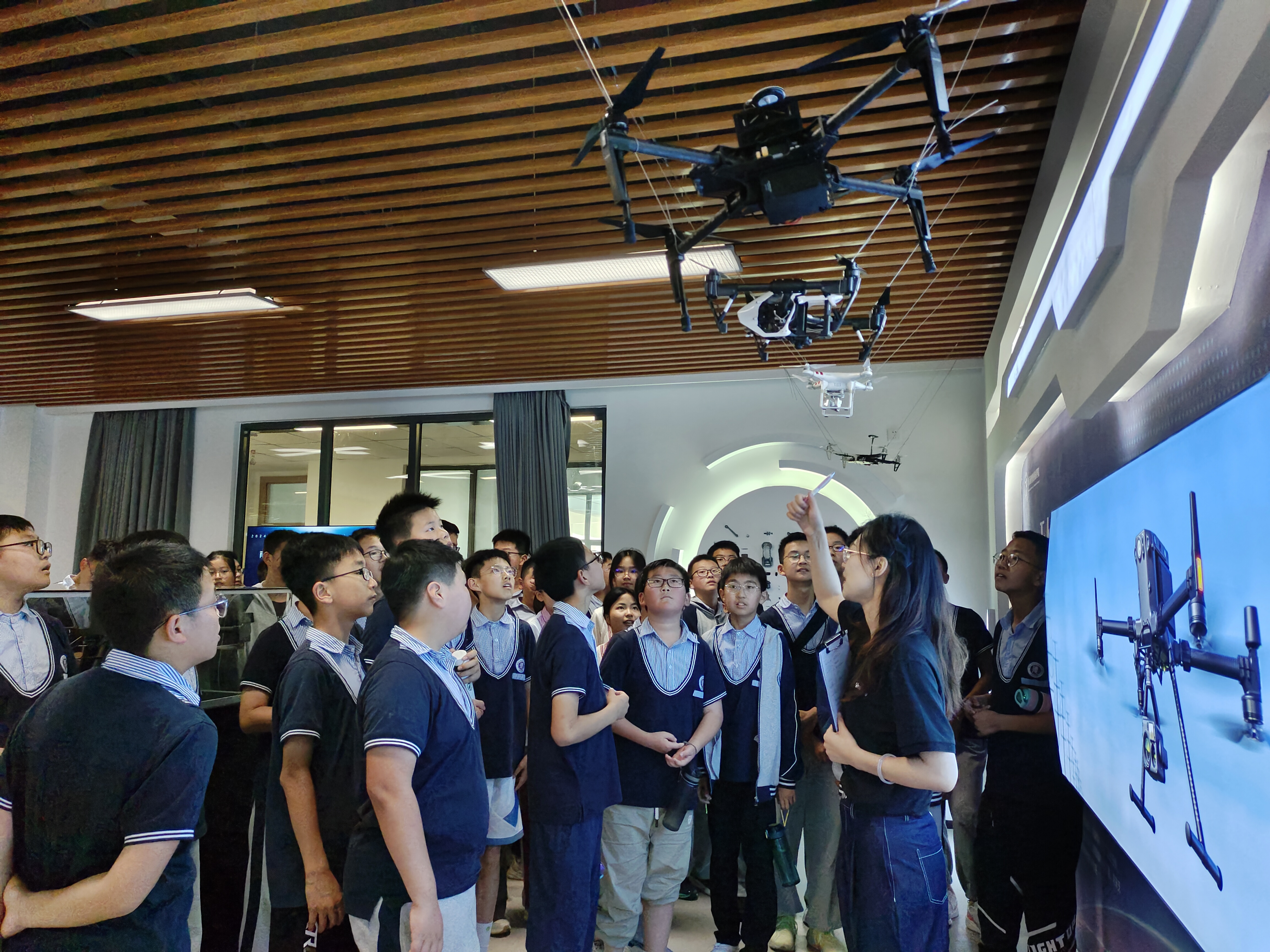 活动期间,学校结合中小学生学习特点和创客校园文化特色,安排了实地参观、科普大课堂、组装体验、室外飞行体验等一系列无人机科普教育活动。在学校慎行楼207,同学们跟随学校无人机专业教师滕老师领略了无人机的发展历程。