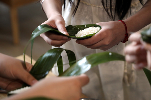 在包粽子体验区,宿管老师从粽叶的折叠、糯米的放置到绳子的捆绑,每一步都进行细致地演示和讲解。师生们围在一起,纷纷动手实践,两片狭长青绿的粽叶,一叠,一卷,小小的“漏斗”放入浸好的糯米和馅料,一折,一包,一扎,一个个棱角分明的粽子就做成了。活动现场弥漫着浓浓的粽香和欢声笑语,师生们在互帮互助中享受着劳动的乐趣。
