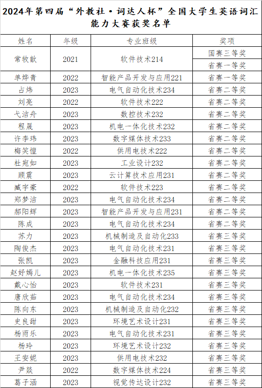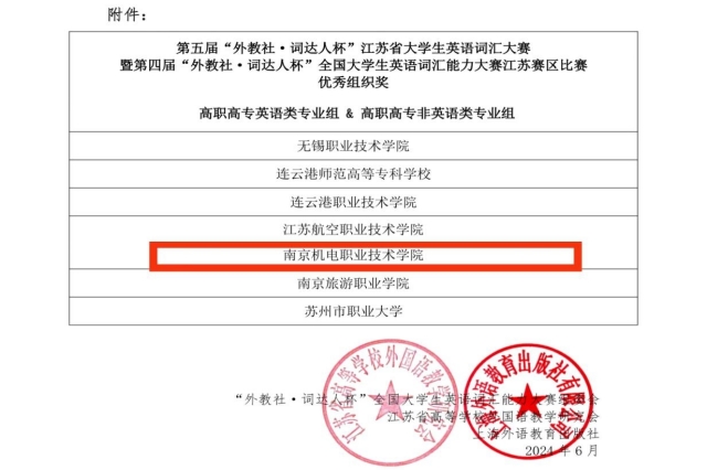 在刚刚结束的第四届“外教社•词达人杯”江苏省大学生英语词汇大赛暨第四届“外教社•词达人杯”全国大学生英语词汇能力大赛中,我校共有950位选手参赛,69位参赛选手脱颖而出进入省赛,其中3位选手进入全国总决赛,经过激烈的角逐,我校选手取得了可喜的成绩,共获得国赛三等奖1人,省赛一等奖2人,省赛二等奖12人,省赛三等奖14人。我校还获得了优秀组织奖的荣誉称号。