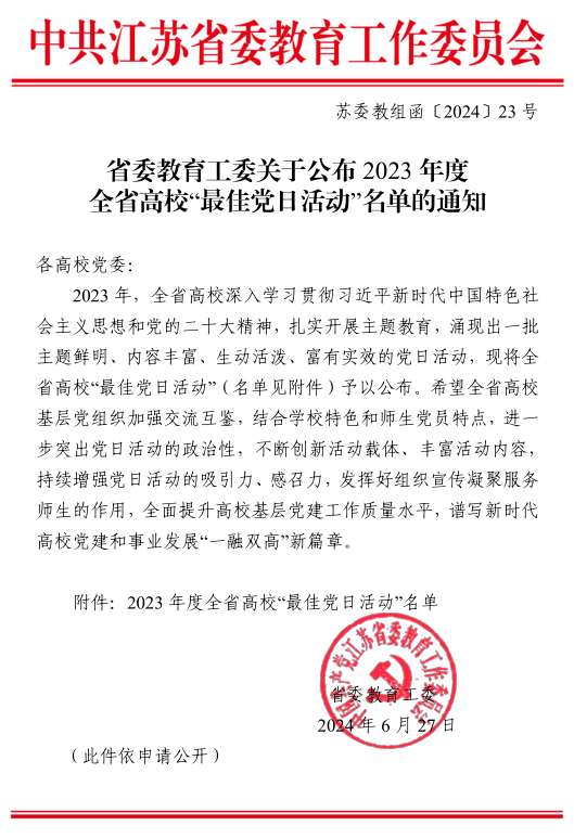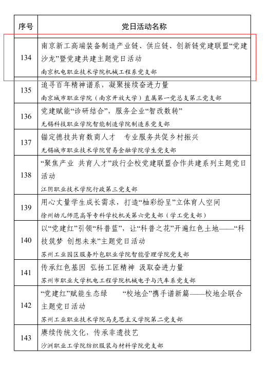 近日,江苏省委教育工委公布了全省2023年度高校“最佳党日活动”评选结果,我校机械工程系党支部“南京新工高端装备制造产业链、供应链、创新链党建联盟‘党建沙龙’暨党建共建主题党日活动”入选2023年度全省高校“最佳党日活动”名单。