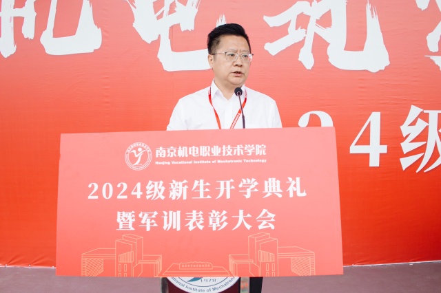 学校党委书记、校长周庆礼以《躬身笃行,逐光奋进》为主题在大会上发表讲话。他代表学校向来自18个省份的2670名新生表示祝贺和欢迎,向陪伴孩子们成长的家长、悉心教导的老师和支持完成军训的全体教官致以崇高的敬意,并向同学们提出了“十个一”的要求:进行一次认真彻底的宿舍大扫除,参加一个让自己成长的社团,和老师认真探讨一次专业问题,创作一件创意创新作品,做一份较为细致的职业规划书,写一封给父母和最亲近的人的信,读一本能改变自己的名著,找到愿意和自己一同前进的一群伙伴,练就一副好身体,保持一颗积极进取的心。让同学们从读好书、长才干、会交流、懂合作、会感恩等方面来培养个人修养。同时也鼓励同学们要积极融入社会并投身建设,在实践中实现自我价值,遇到更好的自己。最后他希望,全校师生与鲲鹏齐飞,秉承“知行合一,自强不息”的校训精神,勤学善思、明理笃行,以更加饱满的昂扬斗志和一往无前的奋进姿态,奋力书写为中国式现代化建设挺膺担当的青春篇章!
