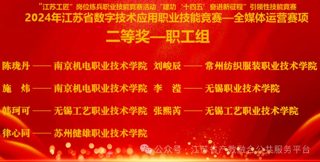2024年10月29日,由江苏省人力资源和社会保障厅举办的“江苏工匠”岗位练兵职业技能竞赛活动——2024年江苏省数字技术应用职业技能竞赛“全媒体运营”赛项全省总决赛在苏州健雄职业技术学院举行。我校信息工程系移动商务专业陈洁老师获得职工组一等奖,陈珑丹、施炜老师获得职工组二等奖;23级移动商务231班葛凡琪、祁欣欣获学生组一等奖,232班吴上垠获学生组二等奖。