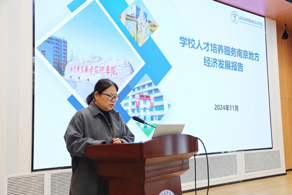 学校教务处处长陈云霞以《人才培养服务南京地方经济》为主题,从教学出发,阐述了教学与招生和就业之间的联系和不足。质控办主任吴伟萍以《挖掘平台数据,对标双高建设标准;推动专业建设,助力就业质量提升》为主题,对招生-培养-就业三方联动进行深入的分析。