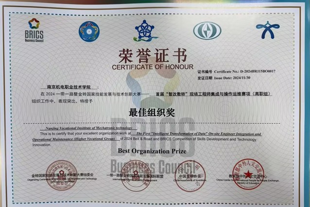 近日,2024“一带一路”暨金砖国家技能发展与技术创新大赛首届“智改数转”现场工程师集成与操作运维赛项全国决赛圆满收官。我校自动化工程系2023级学生朱增杰、孔德虎团队在朱红娟老师的指导下斩获一等奖,指导教师朱红娟获评优秀指导教师,学校获最佳组织奖。