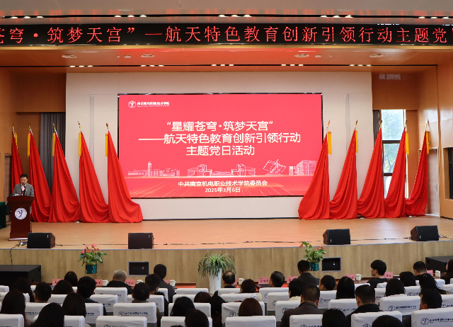 2025年3月6日14:00,米兰官方网页版在乐学楼101举办了“星耀苍穹・筑梦天宫”航天特色教育主题党日活动,本次活动旨在响应习近平总书记的号召,激发学生的科学兴趣,弘扬航天精神,培养学生的创新精神和实践能力,推动学校专业建设与航天文化的深度融合。中国航天科技集团有限公司党组副书记、董事方向明,中国人才研究会副会长、航天科技教育联盟秘书长、北京航天探索馆馆长周岫彬,航天科技集团党群工作部三级业务经理张广科,北京神舟航天软件技术股份有限公司市场营销部主管张凇铭,学校党委书记、校长周庆礼,党委委员、副校长刁爱军,党委委员、副校长孔德丽,党委委员、纪委书记姜振宇,党委委员夏玲玲、党委委员高水冕以及全体党员教师和学生代表参加了本次活动。