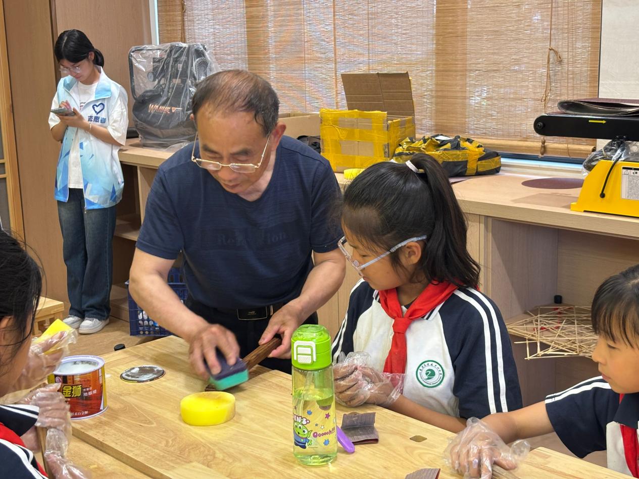 在非遗文化传承与创新中心,80余名中小学生在南通板鹞风筝工坊代表性人物何金泉,江苏省工艺美术名人、非遗传承人夏元安,学校人文社科系张萌老师等非遗艺术家的指导下深度体验南通板鹞风筝、精细木作技艺、非遗竹编的制作过程。孩子们在浓厚的非遗传承氛围中“玩”得不亦乐乎。