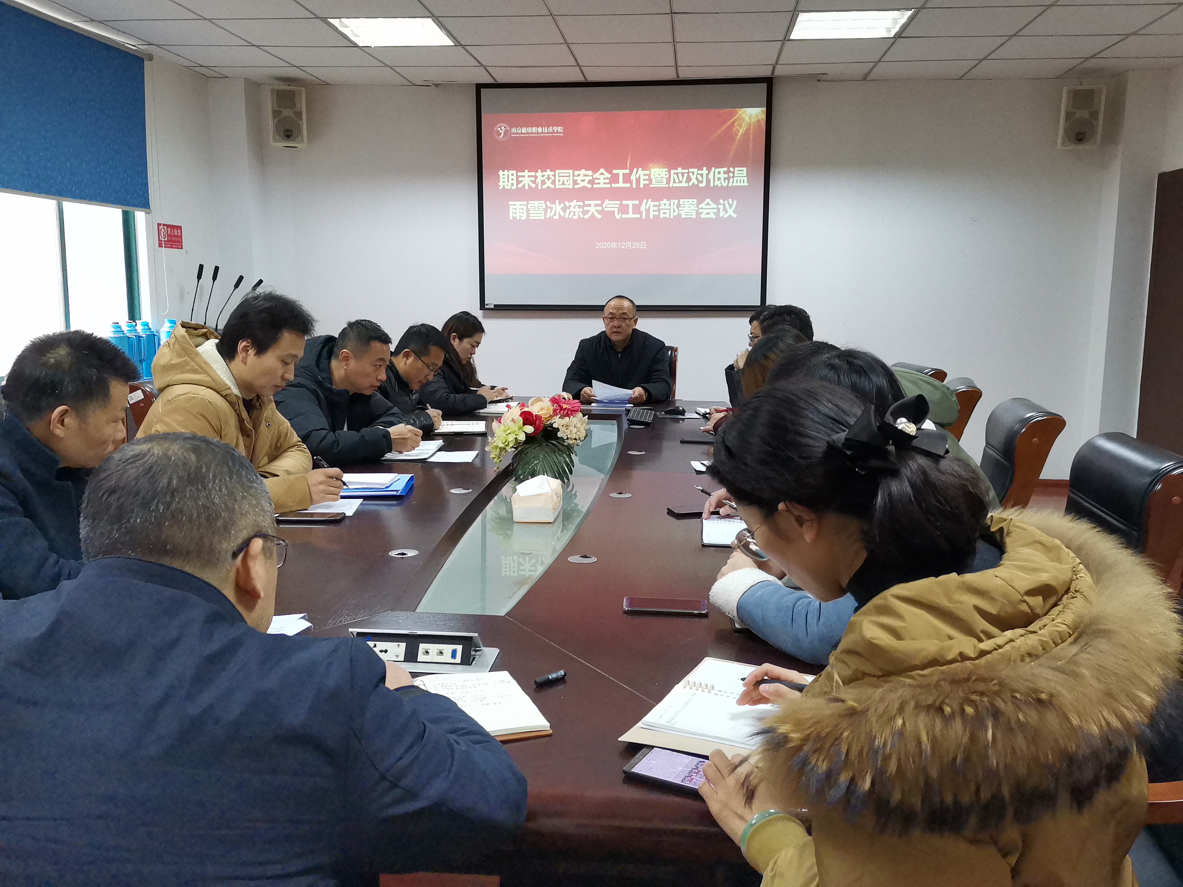 为贯彻落实学院关于做好期末安全工作的要求,加强学院安全管理和教育,强化全体师生安全意识,提高全员应对低温雨雪冰冻天气的能力,2020年12月29日上午在弘德楼213会议室召开期末校园安全工作暨应对低温雨雪冰冻天气工作部署会议。会议由学院党委委员、副院长赵学洪主持,各职能处室、院系主要负责人参会。