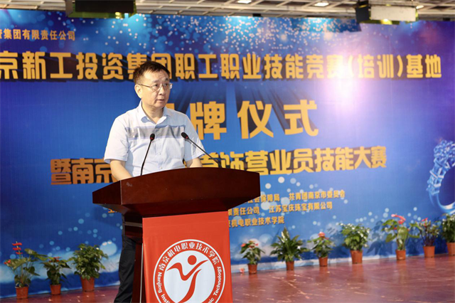 7月28日上午,南京新工投资集团职工职业技能竞赛(培训)基地揭牌仪式暨南京市二级首饰营业员技能大赛在学院中央门校区报告厅举行。市总工会党组成员、副主席陈慧男,新工投资集团党委副书记、工会主席吴启宁,新工投资集团党委委员、总经济师洪薇,学院党委书记、院长周庆礼,学院党委委员、副院长孔德丽,学院党委委员、工会主席姜振宇及市总工会、新工投资集团有限公司相关领导,新工集团各直属企业工会主席及负责培训工作领导出席本次活动。