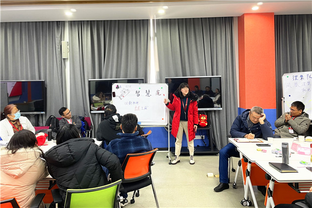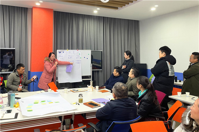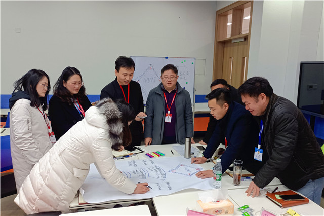此次活动由学校党委委员、副院长孔德丽主持,他以充满趣味的方式将参会人员分成“理念新”、“机制新”、“面貌新”、“成效新”四队,并挑选出队长带领队员共同完成取队名、绘队标、定口号等团建任务。紧接着,孔德丽深入浅出地阐释了“四新”的深刻内涵,提出各队成员需围绕各自的“新”拟定“新”目标、任务或期望,并对照预期将学校当前所存在的问题写在下发的便利贴上。在此基础上,各队根据问题分类梳理情况,聚焦出主要问题后再进行充分讨论,用鱼骨图或思维导图等形式将解决措施呈现出来。