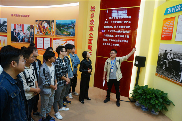 为保障活动有序进行,加强现场互动,系部为每10位学生安排了2名教师负责现场讲解。本次成就展总面积达1.2万平方米,分设综合展、地方展和室外展3个展区,运用场馆展览、网上展览、挂图展示等形式,展出图片(图表)2000多张,实物、模型、沙盘100多件(套),视频及多媒体展品100多件(套),展列228个先进典型和英雄模范人物(集体)。全面展示了新中国成立70年来党领导江苏人民进行建设、改革和发展的伟大历程、巨大成就和宝贵经验,突出展示党的十八大以来全省上下贯彻落实习近平总书记关于江苏工作重要指示精神,着力推动“五个迈上新台阶”,特别是推动高质量发展走在前列、建设“强富美高”新江苏的巨大成就。