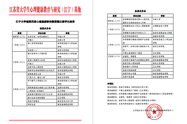 5月18日,江宁大学城第四届心理健康移动微课比赛于线上圆满落幕。我系心理气象站汪元奎、郭嘉俊同学作品《用理解和沟通打开相处之门》获得江宁大学城第四届心理健康移动微课实景式一等奖。