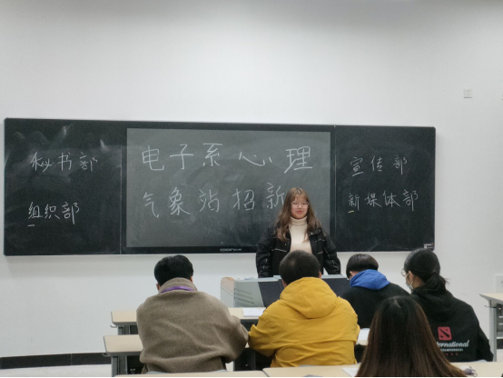 微风带着11月的丝丝寒意,渐冷的天气影响不了电子系心理气象站招新的热情,漫步校园,食堂、宿舍同学们每天都要经过的地方摆放着来自电子系心理气象站学长学姐们精心准备的宣传海报,海报上详细地介绍了电子系心理气象站的组织构成和往届活动举办的精彩瞬间,吸引着来往同学们的目光。学长学姐们顶着渐凉的天气,热情的和感兴趣的同学们介绍电子系心理气象站,同学们则表示了极大的兴趣,纷纷填报了报名表。经过三天的宣传以及初步筛选,于思学楼107教室召开了电子系心理气象站招新的第一轮面试,同学们准备充分跃跃欲试,大家纷纷上台向学长学姐们展现自己,经过反复筛选考虑,选出来成功进入二轮面试的同学。同样在思学楼107教室,通过一轮面试的同学们再次接受了更加激烈的二轮面试,面试的同学们需要回答来自学长学姐们的提问,进一步表现自己。面试结束,经过一天的讨论修改,最终得出新一届电子系心理气象站成员并进行公示。至此,电子系心理气象站招新圆满结束。